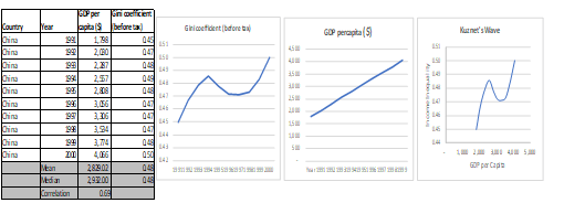 However, the continued widening of income inequality during this rapid growth phase does not necessarily contradict the Kuznets hypothesis, but rather places China squarely in the model’s initial stage of rising inequality. The economy, while rapidly expanding, was not yet structurally mature or advanced enough to reach the hypothetical inflection point where the income gap is expected to narrow. The observed 69% correlation coefficient reinforces this finding, indicating a moderate, positive relationship where income growth and inequality generally increased in tandem.