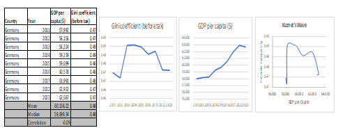 South Korea demonstrated considerable economic resilience throughout the 2011–2023 period, successfully navigating the challenges posed by both the 2008 global financial crisis and the COVID-19 pandemic. GDP per capita experienced substantial year-on-year growth during this interval, a performance supported by a convergence of factors: proactive national health measures, robust household support initiatives, the strategic launch of the Korean New Deal, powerful export sector performance, and strong macroeconomic fundamentals. However, despite this sustained economic expansion, the Gini coefficient exhibited a cyclical trend, indicating that income inequality movements were largely decoupled from the growth of GDP per capita during this period as with Germany and further evidence with the correlation coefficient of -0.51.