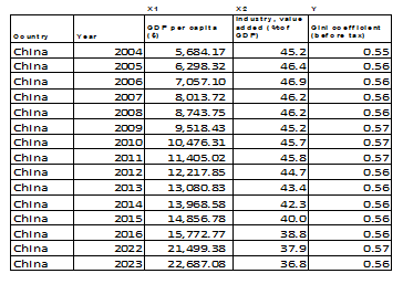 China’s Gini Coefficient, GDP Per Capital and share of industry value added was analyzed across fifteen data points to determine if a relationship exists between the industrialization level of a country and the income inequality. China’s GDP per capita rose from approximately $5.600 in 2004 to over $22,000 in 2023, reflecting rapid industrialization and economic expansion (World Bank, 2024). However, during this same period, the Gini coefficient in China hovered around 0.55 to 0.57 between 2004 and 2023. The effect of industrialization was seen between 2012 and 2016 indicating a marginal narrowing income gap.