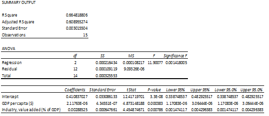 This regression model shows that the relationship between the dependent variable (Gini Coefficient) and the Independent variables (Industry Value Added and GDP per capita is statistically significant and about two-thirds of the variation in the dependent variable can be reasonably explained by the two independent variables. Both variables showed a positive relationship with the dependent variable, meaning an increase in either one is associated with an increase in the dependent variable.