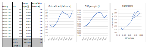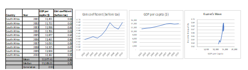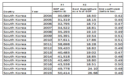 South Korea initially recorded high income inequality from 2004, which gradually declined from 2009 as a result of increased social policies and economic redistribution. The Gini Coefficient, GDP Per Capital and Government expenditure as a share of GDP was analyzed across fourteen data points to determine if a relationship exists between the economic systems/ policies and the income inequality.