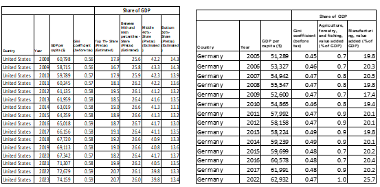 China’s shift from agriculture to manufacturing in urban areas has often left rural workers behind, exacerbating inequality. In the U.S., real GDP per capita rose from approximately $36,300 in 2000 to nearly $60,000 in 2021 (Bureau of Economic Analysis, 2022), fueled by technology and service-sector growth. Simultaneously, income inequality widened, with the Gini coefficient rising from 0.40 in 2000 to 0.49 in 2020 (Census Bureau, 2022). The top 10% of earners captured nearly 50% of the total income, reflecting a stark disparity (Piketty & Saez, 2020). The shift from manufacturing to service-oriented industries has left behind lower-skilled workers, contributing to increasing inequality contrary to the Kuznets’s hypothesis.